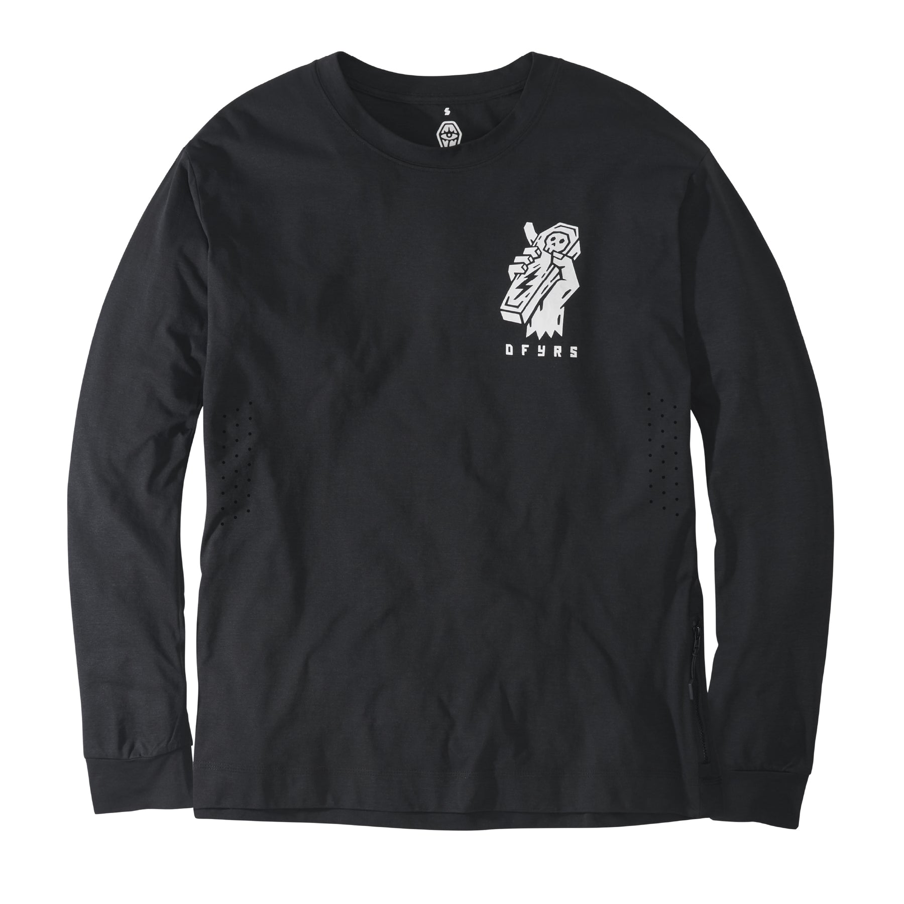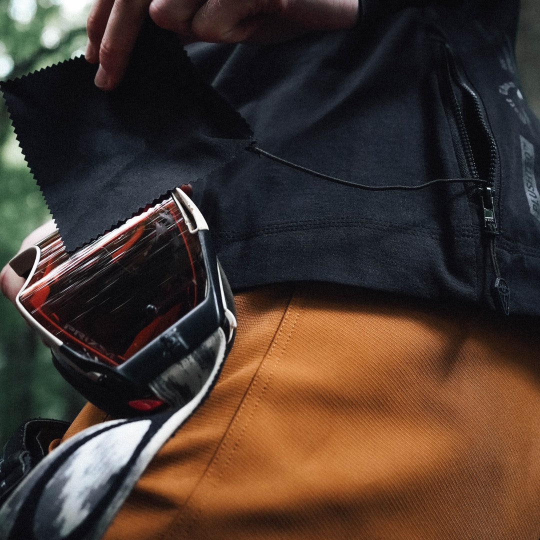 Secure zippered side pocket for ride essentials, integrated lens cloth for clear vision, and laser-cut armpit perforations for discreet airflow when things heat up.
